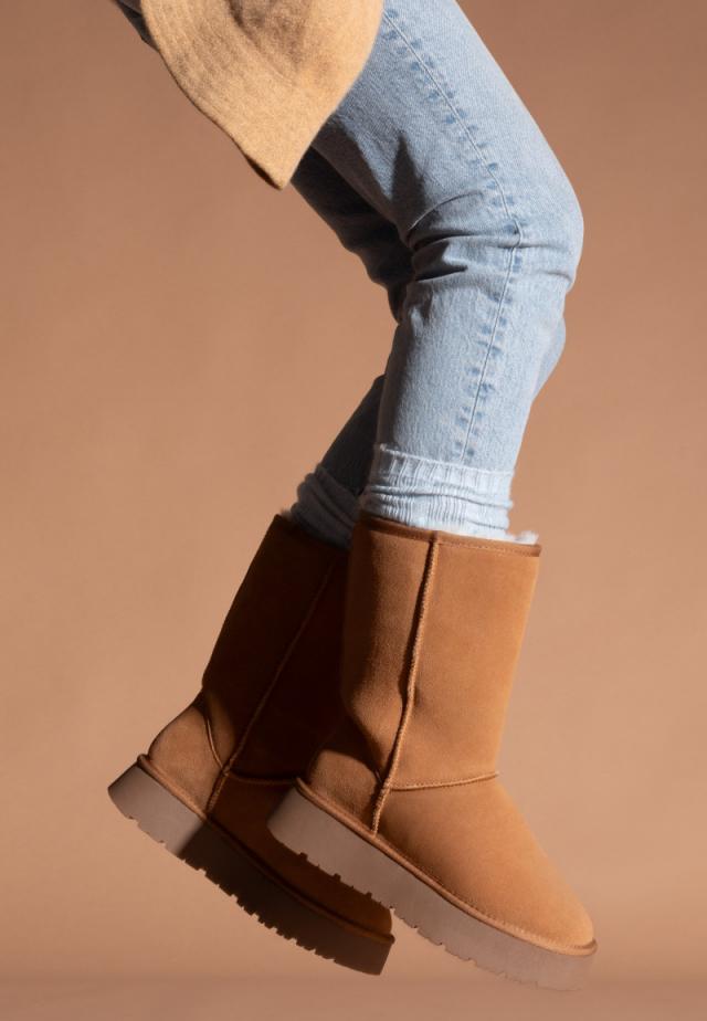 Fiche technique Hauteur de talon 4 cm Composition Extérieure Daim de vache Première de Propreté Laine de mouton Semelle Extérieure TPR (Caoutchouc Thermopropylène) Hauteur de tige 19 cm Tour de mollet 14 cm Références spécifiques ean13 3522226378840